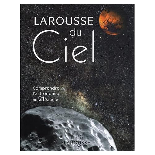 Somme unique, le Larousse du Ciel répond clairement aux questions que chacun se pose aujourd'hui sur l'Univers. Il offre un panorama vivant et très actuel des connaissances en astronomie en abordant : la formation et l'évolution de l'Univers, l'histoire de l'astronomie depuis l'Antiquité, la description des objets célestes, les instruments et techniques d'observation et d'exploration... A la fois exhaustif et accessible à tous, le Larousse du Ciel a été réalisé par 94 experts, tous spécialistes de leur domaine. L'Univers en questions. Où sommes-nous ? D'où venons-nous ? Où allons-nous ? Sommes-nous seuls ? Le point sur l'histoire de notre Univers, les différents scénarios possibles relatifs à l'avenir de notre galaxie, et l'état des recherches sur une vie extraterrestre. Du ciel à l'Univers. Cette vaste fresque chronologique retrace l'histoire des hommes et des idées qui ont fait progresser la découverte et la connaissance du ciel, de l'Antiquité à nos jours. L'astronomie de A à Z. D'aberration optique à zodiaque, en passant par astéroïde, big bang, étoile, pulsar, quasar, relativité..., cette partie " dictionnaire " éclaire près de 300 notions essentielles en astronomie. L'Univers en chiffres. 88 fiches et 20 tableaux, pour trouver rapidement des informations chiffrées sur les constellations, les principaux observatoires, les plus grands télescopes, les étoiles les plus brillantes, les planètes et leurs satellites... 465 photos en couleurs, en provenance de la NASA, de l'Agence spatiale européenne, de l'ESO ou d'autres grands observatoires, illustrent les merveilles du ciel profond. 180 schémas détaillés éclairent les notions les plus abstraites.Relié=478 pages. Editeur Édition =Larousse; Nouvelle (12 mai 2005). Collection =Larousse de. Langue =Français. ISBN-10=2035604346. ISBN-13=978-2035604347. Dimensions du produit=29 x 4,2 x 23 cm. Moyenne des commentaires client =5.0 étoiles sur 5 1 commentaire client. Classement des meilleures ventes d'AmazonAstronomieSciences de la vie - Biologie - Génétique=838.238 en Livres (Voir les 100 premiers en Livres) .zg_hrsr { margin: 0; padding: 0; list-style-type: none; } .zg_hrsr_item { margin: 0 0 0 10px; } .zg_hrsr_rank { display: inline-block; width: 80px; text-align: right; } n°1317 dans Livres > Sciences, Techniques et Médecine > n°5514 dans Livres > Sciences, Techniques et Médecine >.Etant passionné d'astronomie ce guide du ciel est un bon livre qui est un condensé pour un bon débutant dans ce domaine.